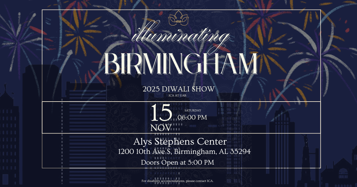 The Indian Cultural Association at UAB proudly presents Diwali 2025: Illuminating Birmingham. The Diwali show is one of Birmingham’s largest cultural showcases, bringing together talented performers from across the city to celebrate our community. This year’s theme highlights the stories of our people that make up this special community and illuminates the experiences that make Birmingham our home. Join us for an evening of light, joy, and cultural celebration that welcomes all of Birmingham to experience the beauty of Diwali.